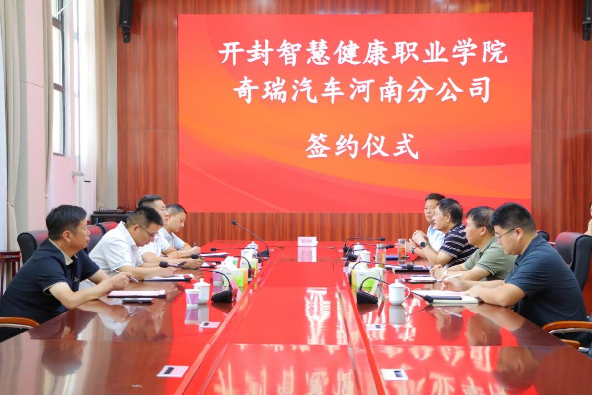 为深入学习贯彻党的二十届四中全会精神,深化校企合作、产教融合,9月11日,开封智慧健康职业学院与奇瑞汽车河南分公司签约仪式在学术交流中心2号报告厅举行,校长王森、副校长窦新旺、陈刚,奇瑞汽车河南分公司负责人刘二成、梁楠、李柳、李小伟出席签约仪式。
